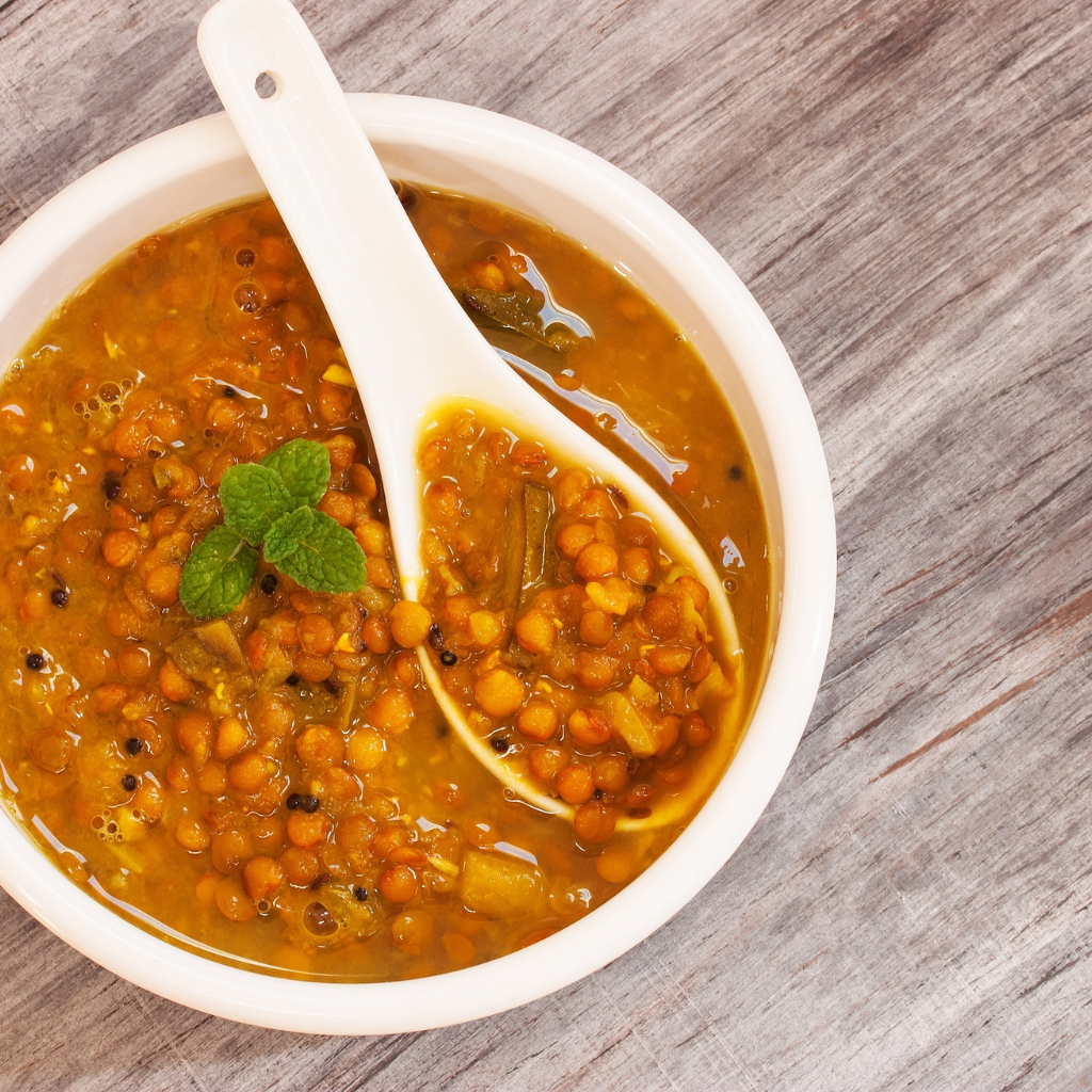 Red Lentil Coconut Curry with turmeric rice & roasted eggplant (vegan)
